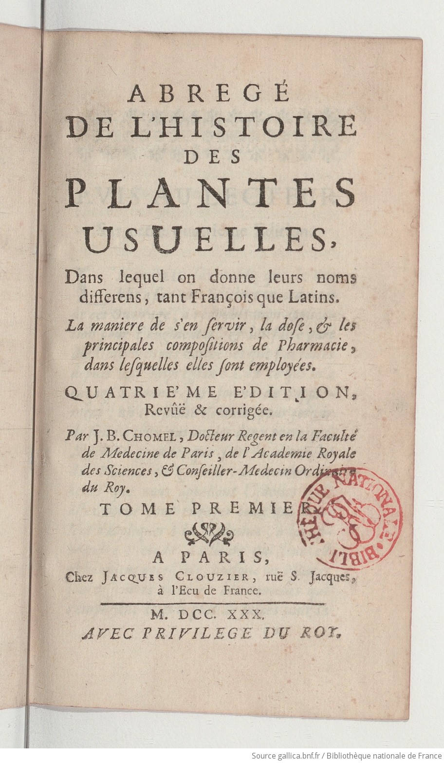 Découvrir l’ouvrage de J-B. Chomel : Abrégé de l’histoire des plantes usuelles, dans lequel on donne leurs noms différens françois et latins, la manière de s’en servir, la dose et les principales compositions de pharmacie dans lesquelles elles sont employées… par J.-B. Chomel,… | Gallica (bnf.fr)
